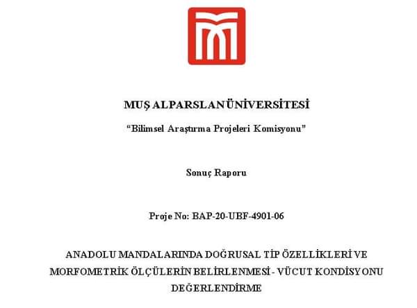 2 yıl gibi uzun bir süredir Prof. Dr. İhsan SOYSAL hocam ve Öğretim Görevlisi Önder Bayram ÇOBAN ile birlikte "Anadolu Mandalarında Tip Özellikleri ve Morfometrik Ölçülerin Belirlenmesi - Vücut Kondisyonu Değerlendirme" konusunda yürüttüğümüz çalışmayı bugün itibariyle tamamlamış bulunuyoruz. Proje çalışmasına destek veren sayın Rektörümüz Prof. Dr. Fethi Ahmet POLAT'a, sayın Rektör Yardımcımız ve Dekanımız Prof. Dr. Yaşar KARADAĞ'a, Tarım ve Orman Bakanlığı, Tarımsal Araştırmalar ve Politikalar Genel Müdürlüğümüze, Önceki Hayvancılık ve Su Ürünleri Daire Başkanımız Sayın Dr. Ali AYAR'a, Önceki Muş Tarim il Müdürümüz Mehmet AYDIN'a ve Il Müdür Yardımcısı Dr Ferit YILDIZ'a , Bitlis İli Damızlık Manda Yetiştiricileri Birliği Başkanı sayın İsmet ÇALIŞIR'a ve Yönetim Kurulu Üyelerine, Bitlis İli Damızlık Manda Yetiştiricileri Birliğinin fedakar ve gayretli çalışanlarına, bizlere işletmesini açan ve ekmeğini paylaşan baş tacı yetiştiricilerimize sonsuz teşekkür ederiz. 2023 yılı içerisinde düzenlenecek kurslar ile Mandalarda Tip Sınıflandırması ve Vücut Kondisyonu Değerlendirme sisteminin ülke genelinde yaygınlaştırılarak manda ıslahına katkı sunulması hedeflenmektedir.